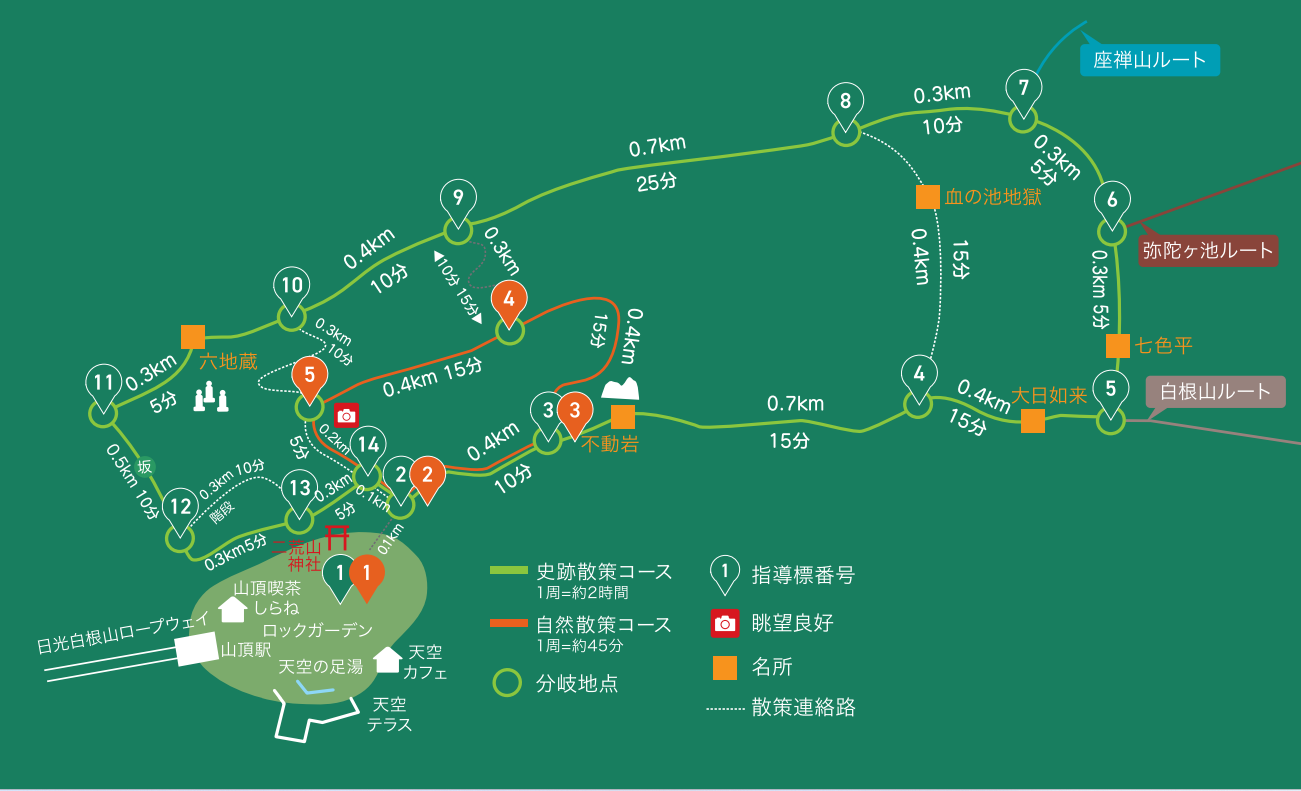 今回選択したコースは、ロープウウェイ駅から史跡散策コースを抜け、白根山コースから山頂へ向かうコース